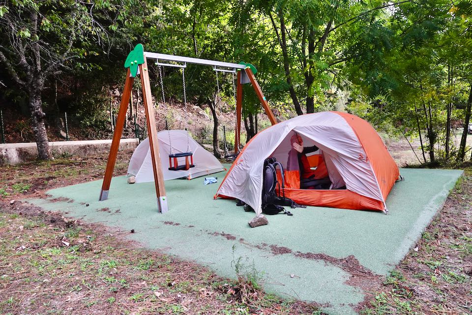 Vorsichtig geworden, versuchen wir bei der nächsten Hütte anzurufen. Alle Anrufe verlaufen ins Leere. Die Hoffnung ist noch da, heute Abend noch etwas auf den Teller zu bekommen. Da unsere geplante Einkaufsmöglichkeit nicht vorhanden war, haben wir erst wenig Essen im Rucksack. Bei Sonnenuntergang erreichen wir unseren Etappenort. Die Hütte ist wie inzwischen befürchtet, geschlossen und ausser ein paar geschlossenen Häusern, Spielplätzen und Tennisplätzen ist nichts vorhanden. Ein komischer Ort weit ab vom nächsten Dorf. Vor einem Haus finden wir eine Wasserstelle und der Bach hat viele schöne Badegumpen wo wir uns erfrischen können. Zum Glück haben wir Zelt und Kocher dabei. Nur das Schnitzel können wir uns träumen.