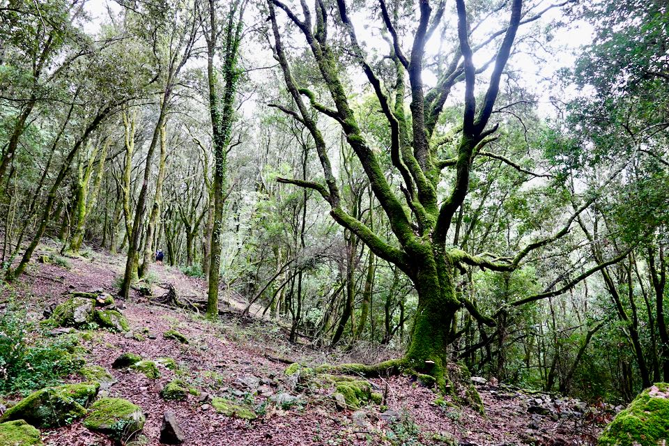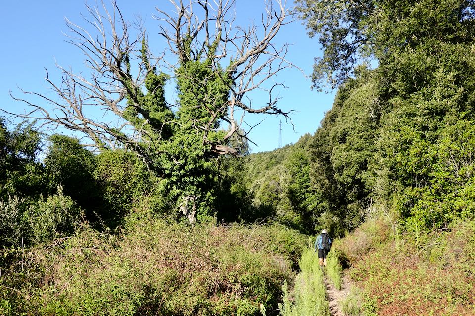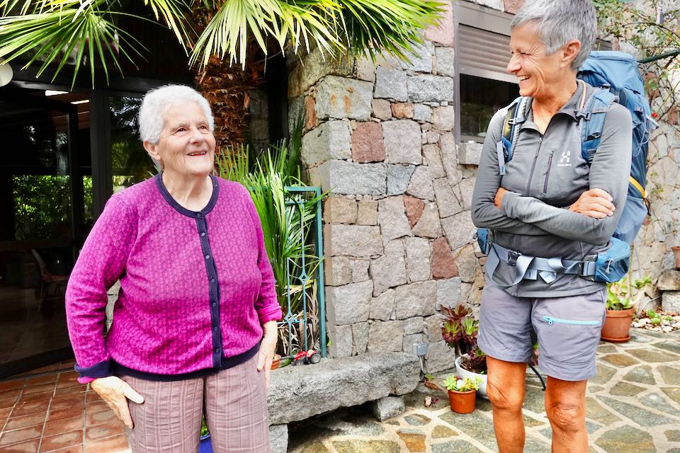 Wir steigen zum Col de Laparo auf, wo wir den GR 20 kreuzen. Mit der Einsamkeit, die wir in den vergangenen Tagen spürten, ist nun schlagartig Schluss. Es wird geplaudert und diskutiert, viele GR 20 Wanderer sind unterwegs. Für uns geht es nun runter nach Cozzano und sofort sind wir wieder alleine unterwegs. Eingangs Dorf kommen wir an einer Tankstelle mit grossem Lebensmittelladen vorbei. Endlich können wir unseren Proviant aufstocken. Auf dem Weg zu unserer Unterkunft laufen wir an einem Restaurant vorbei, das am Abend offen hat. Da hüpft das Herz vor Freude.