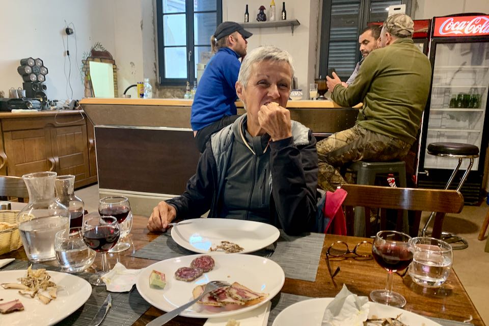 Nach halb sieben geht die Bar tatsächlich auf. Wir nehmen an einem der wenigen, nicht mit Sachen belegten Tisch platz. Die Barfrau ist nicht sonderlich an uns interessiert und arbeitet da und dort. Erst als ein Mann in Jägerkluft auftaucht, können wir bestellen. Nun gehts vorwärts. Immer mehr Einheimische kommen und genehmigen sich einen Pastis. Auch eine handvoll Frauen aus dem Dorf mit Schalen und Schüsseln tauchen auf. Aha, da wir unser Nachtessen geliefert. Das Essen ist wunderbar. Die Männer an der Bar beginnen zu rauchen, es ist ihnen anscheinend egal, dass wir am Essen sind. Und so fühle ich mich in die Zeit zurückversetzt, als bei uns noch geraucht wurde im Restaurant. Grauenvoll. So verlassen wir baldmöglichst den rauchigen Ort und machen nochmals einen kurzen Verdauungsspaziergang. Nun bemerken wir eben, dass die Sau verschwunden ist. In unseren Tellern war sie jedenfalls nicht gelandet...