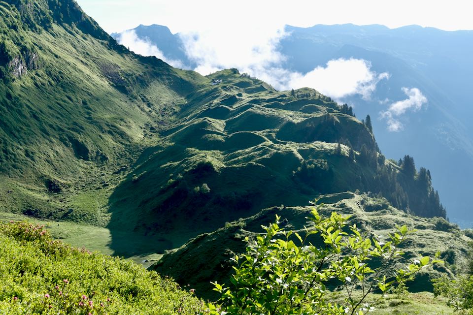 Die Wolken hängen tief, als ich heute Morgen Glaus verlasse. Über Schwendi steige ich hinauf zur Alp Oberstaffel. Es ist so ziemlich ein Tiefpunkt hier oben auf der Alp. Dichter Nebel, alles ist nass. Ich überlege, ob ich bei der mir entgegenströmenden "Gastfreundschaft" gleich weitergehen soll. Der Regen und die Tageszeit überzeugen mich zu bleiben. Es wird Morgen und die Sonne erwärmt die regengetränkte Landschaft.