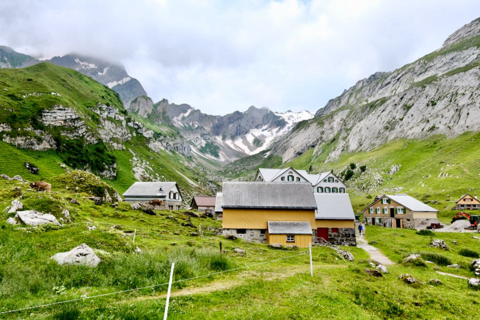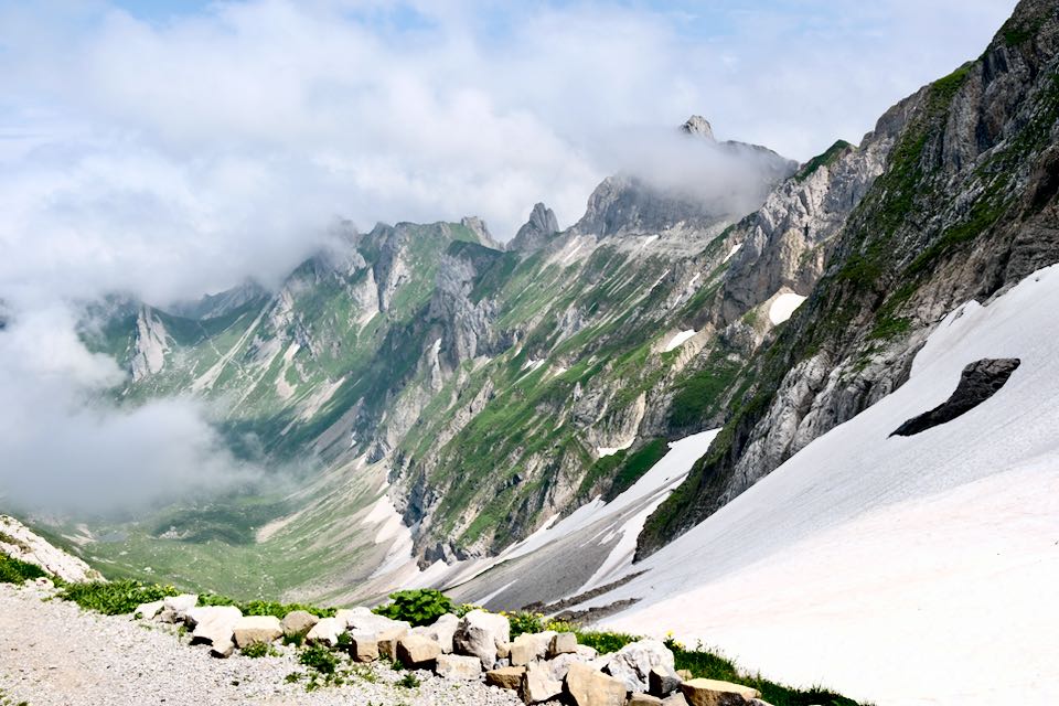 Jetzt geht es in die Berge. An den Berghängen liegt noch viel Schnee. Zwischen Altmann und Säntis liegt mein heutiges Tagesziel, der Rotsteinpass. Die Hüttendichte im Alpstein ist sehr hoch.