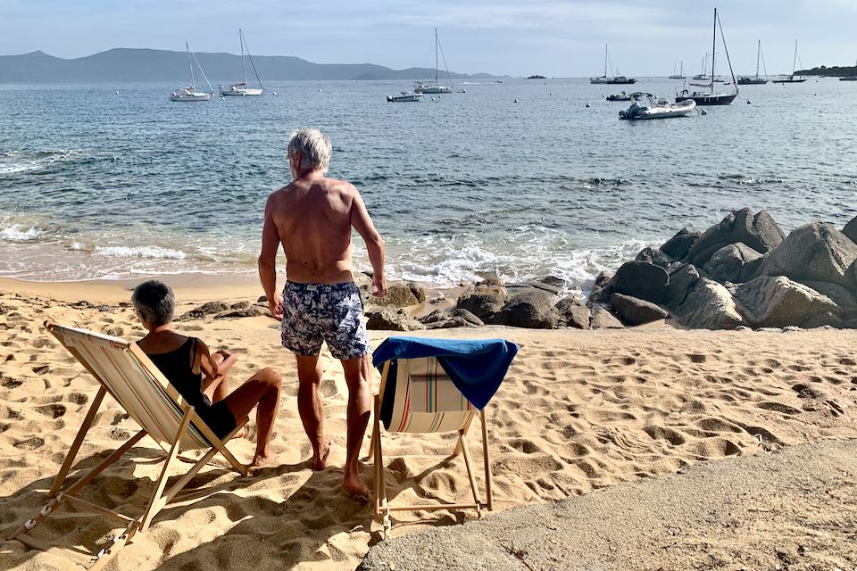 Heute geht's ans Meer. Durch Macciabüsche und Steineichen steigen wir zur Plage de Cupabia ab. Einige nehmen ein kühles Bad im Meer die anderen einen Kaffee in der Strandbar. Der Campingplatz ist auf den Karten noch eingezeichnet, existiert jedoch nicht mehr. So ziehen wir weiter über Serra di Ferro nach Porto Pollo, wo wir ein Bungalow gleich am Strand bekommen.