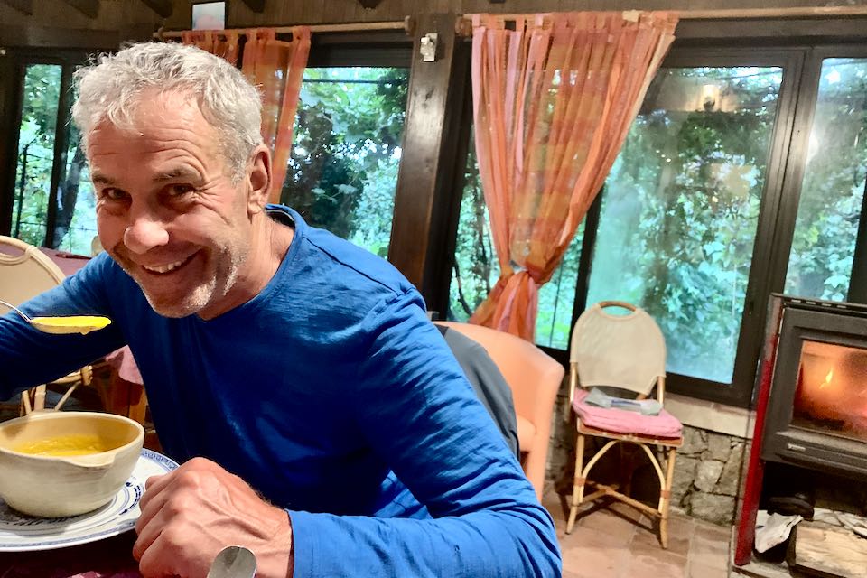 Am nächsten Tag geht es weiter über Hügel, durch Wälder, dichtes Buschwerk und kleinen Dörfern zum Col de Saint Georges. Im einzigen Hotel hier bekommen wir ein Zimmer. Auch den Ankommensapero gibts hier. An der weiss gedeckten Tafel lassen wir uns ein feines Nachtessen servieren.
