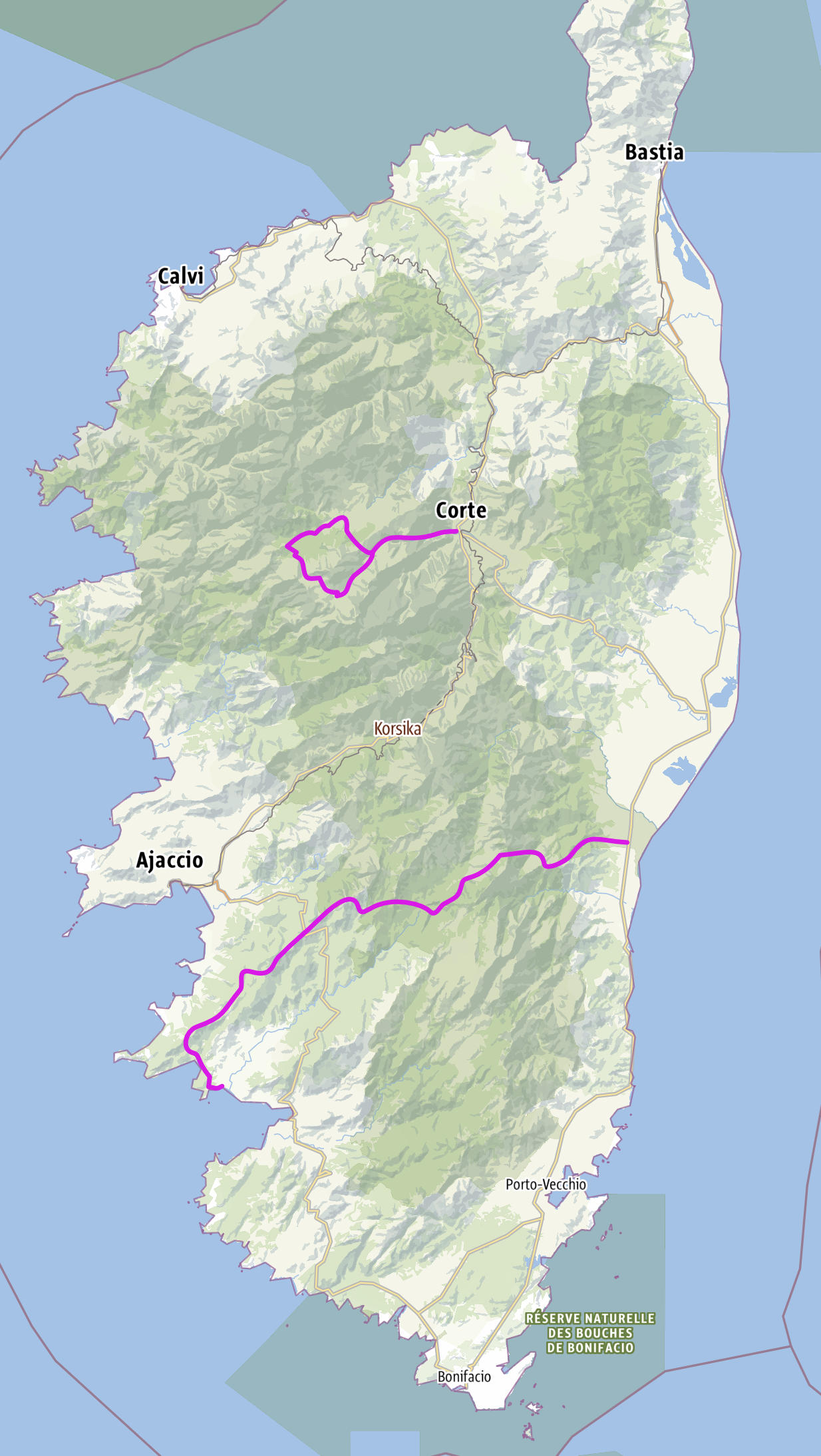 Von Corte westlich durch das Tavignano-Tal zur Segahütte. Dann noch Calaccucia, Albertacce zur Cascade de Radule und weiter zum Col de Vergio. Nun dem GR 20 Richtung Süden am Ninosee vorbei ins Tavignanotal zur Segahütte und Corte.