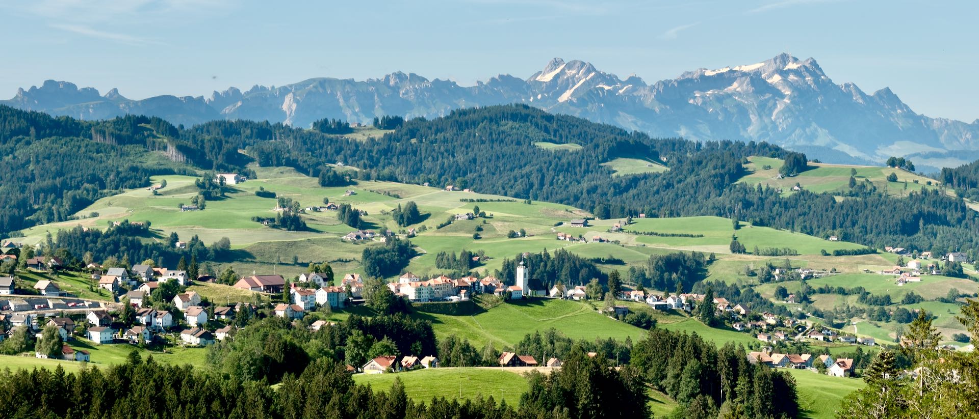 Von Rohrschach am Bodensee geht's über Wiesen, Wälder und grüne Hügel nach Heiden, meinem ersten Etappenort. Die nächste Etappe nach Appenzell starte ich früh. Es ist viel Sonnenschein und Wärme angesagt. Hügel rauf und runter, in den tiefen Tobel ist die Luft dick und heiss. So rinnt auch der Schweiss in Bächen über meine Stirne. In der Ferne taucht der Säntis auf.